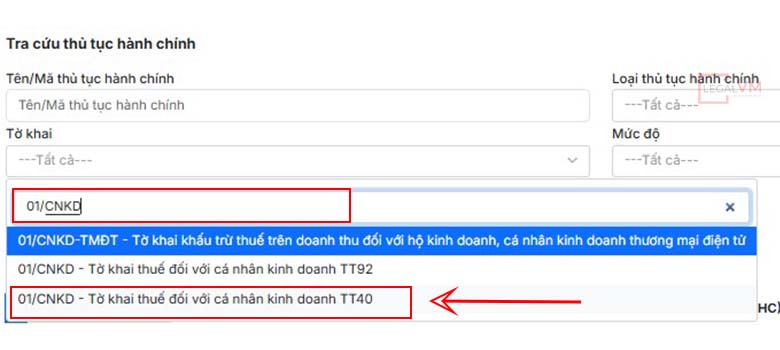 – Tại mục ” Tờ khai ” ấn tìm kiếm ” 01/CNKD – Tờ khai thuế đối với cá nhân kinh doanh ” ⇒ Ấn ” Tìm kiếm “. Lưu ý: Thông thường, bạn chỉ cần nhập 01/CNKD hệ thống sẽ gợi ý ra luôn cho bạn.