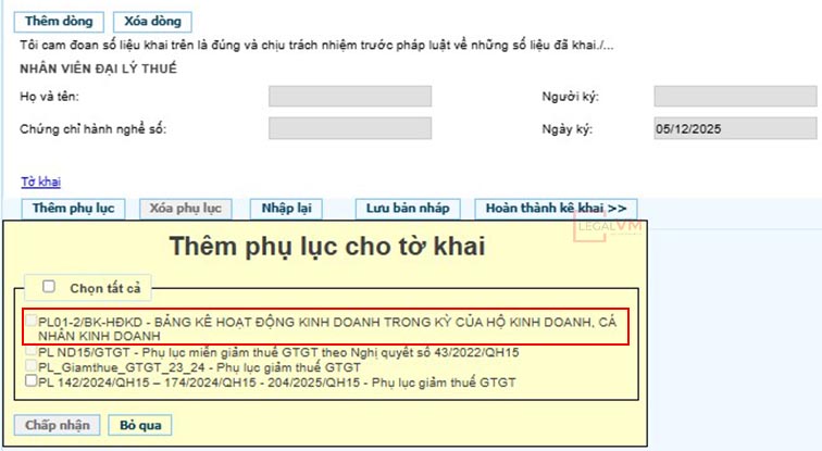 Sau khi điền xong tờ khai, kéo xuống cuối, chọn “ Thêm phụ lục “ chọn “ PL01-2/BK-HĐKD – BẢNG KÊ HOẠT ĐỘNG KINH DOANH TRONG KỲ CỦA HỘ KINH DOANH, CÁ NHÂN KINH DOANH” (bảng kê hoạt động kinh doanh) nếu có thông tin chi tiết: