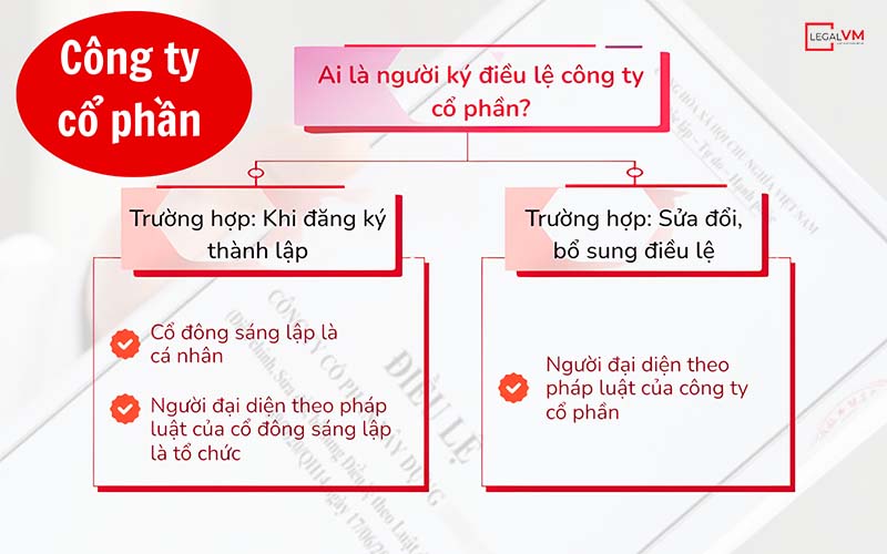 Khoản 3, Khoản 4 tại Điều 24, Luật Doanh nghiệp 2020 đã quy định, để điều lệ công ty có hiệu lực và được công nhận hợp pháp cần có chữ lý của người đại diện pháp luật hoặc của các cổ đông sáng lập công ty. Tùy theo từng trường hợp mà điều lệ công ty cổ phần sẽ cần người ký tên khác nhau gồm: