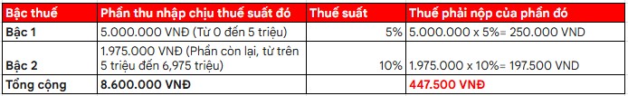 (Giải thích tại sao phải áp dụng thuế suất: Nếu chúng ta không chia bậc mà áp dụng luôn mức 10% cho toàn bộ 6.975.000 VNĐ, số thuế phải nộp sẽ là 6.975.000 x10% = 697.500 VNĐ, cao hơn nhiều. Việc chia bậc đảm bảo rằng phần thu nhập ở mức thấp vẫn được hưởng ưu đãi thuế suất thấp nhất.)