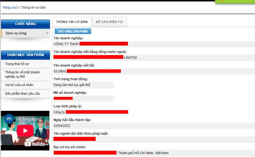 Sau khi nhấp vào doanh nghiệp bạn muốn tìm kiếm. Kết quả hiện thị sẽ gồm các thông tin sau: